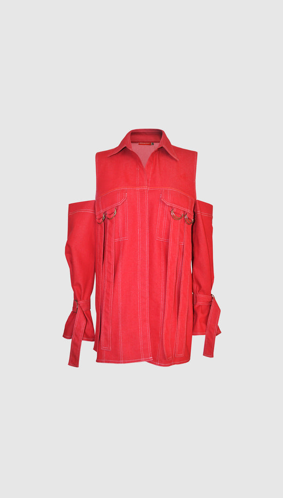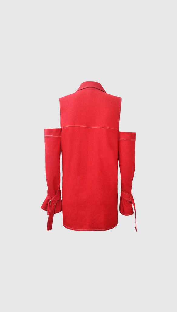 Denim Jacket with a collar features concealed placket, front patch pocket with a flap and two belts attached on each side. Cut out sleeves with belt fastenings.